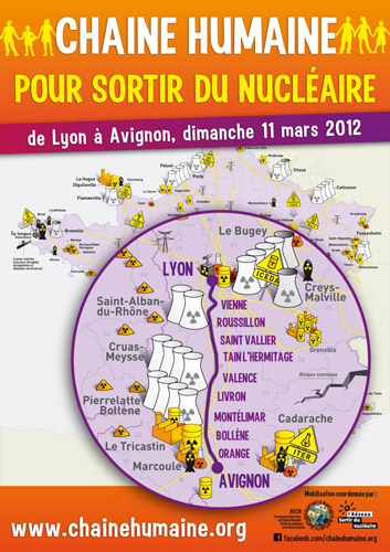 Un an exactement après l'accident nucléaire de Fukushima, des centaines de milliers de japonais on commémoré cette tragique catastrophe, en appelant leur gouvernement à abandonner cette forme de production électrique. En communion avec eux des dizaines de milliers de Français, ont formé entre Lyon et Avignon une chaine humaine de 230 kilomètres pour exprimer leur volonté de sortir aussi la France du nucléaire. Nous étions 60 000 à nous donner la main, mais voyez plutôt la revue des reportages télévisés qui on couvert cet événement :