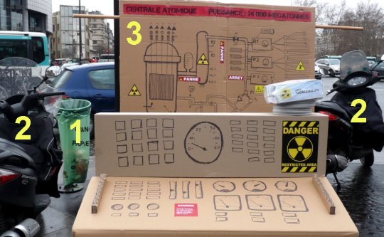 ☢ Cette manifestation manquerait de piquant sans la présence de notre principal détracteur, qui rassemble à lui seul tout l'entêtement scientiste, j'ai nommé le professeur Proton. Il n'a pas hésité à nous défier en s'installant à proximité de notre rassemblement d'antis. Plus parlant que le dernier fichier power point sur l'EPR, présenté par Areva au Brésil. Plus culotté que les discours de Bernard Bigot au Viet Nam, et bien plus hypnotique que le Visiatome. Le professeur Proton à installé devant nos yeux ébahis un simulateur d'accidents nucléaires. Il n'a pas hésité à lancer sa machine, se voulant rassurant à chaque nouvelle alarme que présentait son tableau de commande "biodégradable", se vantait-il. Mais quelle ne fut pas notre inquiétude quand nous avons aperçu des panaches de fumée s'élever près de notre podium, était-ce vraiment une simulation professeur ? n'aurions-nous pas une fois de plus servis de cobayes ?