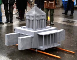 C'est en signe de protestation que cette réplique miniature du parlement japonais est portée en procession autour de l'assistance.