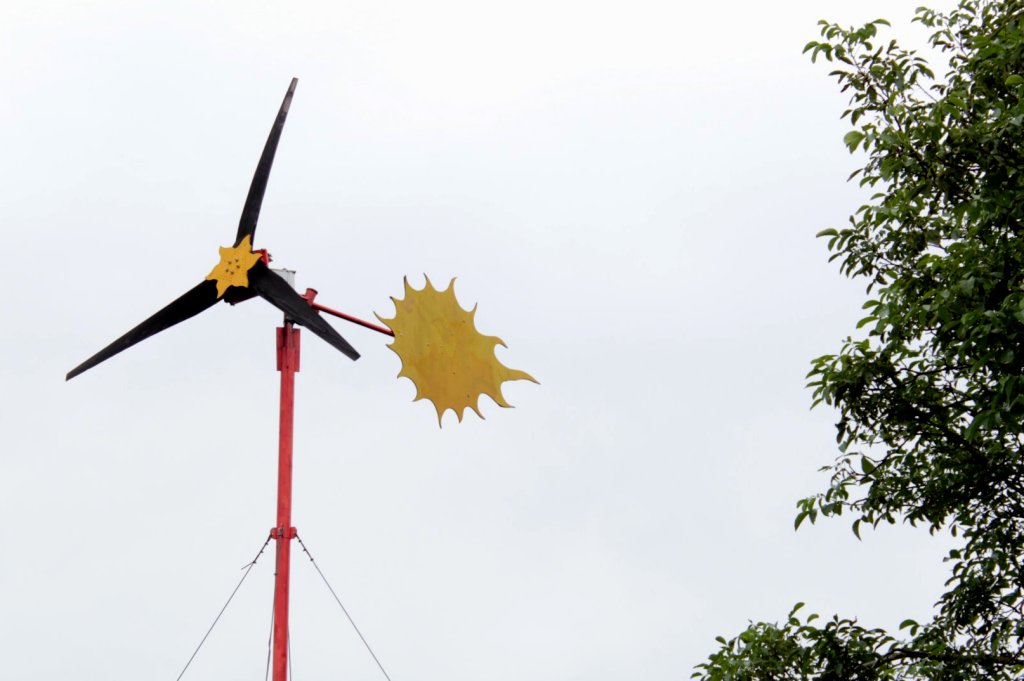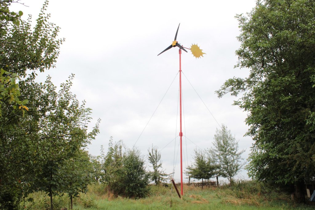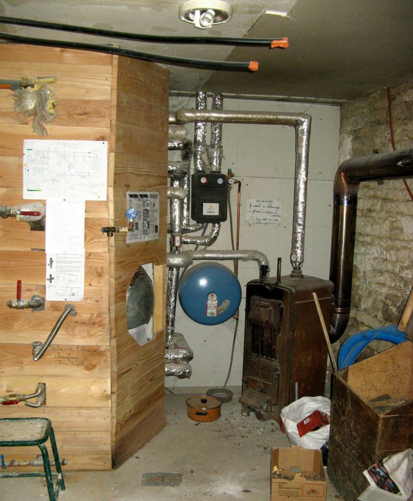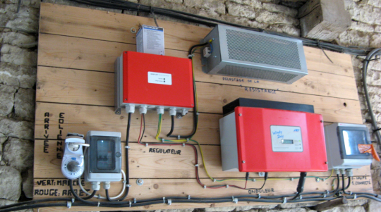 ❦ Cédric, un permanent nous fait la visite, on monte à l'étage dans le bâtiment principal, par un escalier sous lequel une petite pièce abrite les toilettes sèches. Il y a un grand dortoir bien isolé et chauffé. La chaudière à bois se trouve dans un local au rez de chaussée. Comme la mairie accorde à tout habitant de la commune un droit d'affouage, cela permet de l'alimenter, moyennant quelques transports depuis la forêt. Des panneaux solaires thermiques installés au Sud du bâtiment principal, complètent l'apport en chaleur. Une nouvelle salle de réunion a été raccordée à ce réseau de chauffage, des douches sont aussi en cours de travaux. Et puis il y a Ginette qui est belle comme un soleil. L'éolienne à été haubanée sur la hauteur au fond du jardin, lors du festival Burlesque. Un tableau électrique avec régulateur, onduleur, interrupteur et autres boitiers électroniques permet de la raccorder. L'électricité qu'elle fournie, auto-consommée, suffit à réduire sensiblement la facture envoyée par Enercoop.