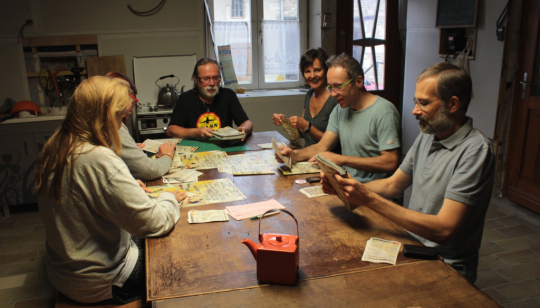 ❦ Nous avons participé à la vie de la maison en préparant un repas avec ce que nous avions apporté. Marie, une permanente nous a aussi proposé d'effectuer une distribution de tracts sur des tournées qu'elle a organisé, aussi nous avons parcouru les campagnes environnantes pour annoncer le festival contre la grosse poubelle qui se tenait le week-end suivant. Ce fut une impression de tranquillité et le contact avec les locaux fut toujours cordial. Il y a des vélos disponibles dans la grange, et si le temps ne se prête pas au cyclotourisme, une bibliothèque permet de se documenter sur diverses questions d'environnement. Plusieurs plaquettes informent sur l'impact de nos consommations d'eau, sur l’intérêt du compostage, la mise en place de l'éolienne, et sur le projet CIGEO. Un ordinateur aide à garder le contact avec les nouvelles du web, ou au pire avec celles de la télévision dont personne n'a noté l'absence pendant notre séjour.