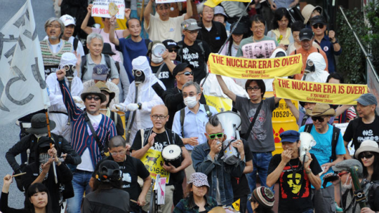 ♥ Notre pensée s'adresse d'abord aux activistes japonais qui ont manifesté à Tokyo, ce dimanche 13 octobre au lendemain de notre action, pour réclamer à leur gouvernement, l'arrêt définitif du nucléaire dans leur pays. Cet évènement a principalement été mené par la formation Metropolitan Coalition Against Nukes, qui organise tout les vendredi des rassemblements près de la résidence du premier ministre, pour ne pas que l'accident toujours en cours tombe dans l’indifférence des autorités.