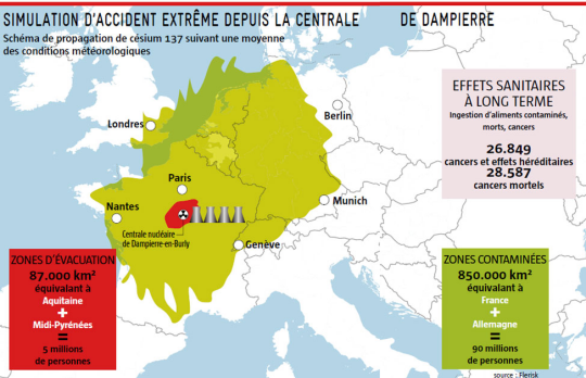 ⚠️ L'illustration ci-dessus est reprise d'une publication du Journal du Dimanche consécutivement à la mise au jour d'un rapport confidentiel de l'IRSN : Le scénario noir du nucléaire : 10 mars 2013 - LeJDD.fr