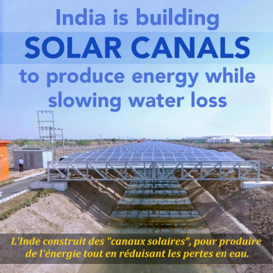 🌞 Illustration : mis en service en 2012 cette couverture de panneaux photovoltaïques sur un canal d’irrigation permet d'éviter l'évaporation de 9 millions de litres d'eau tout en amenant une capacité de 1MW d'électricité : Isfoundation.com