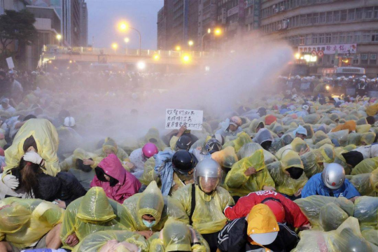Photo : Manifestants aspergés par des canons à eau sur Zhongxiao West Road à Taipei dans le début de la matinée du 28 Avril 2013, alors que les deniers occupants sont repoussés par la police. Photo crédit : Reuters