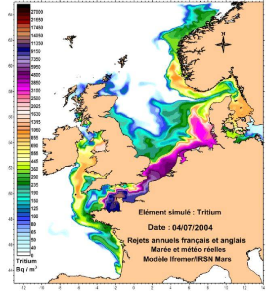 Illustration : Rejets en mer de l'usine d' Areva La Hague et de Sellafield (GB) via Ifremer/IRSN « Dispersion des radionucléides dans les mers du nord-ouest de l’Europe : observations et modélisation.» : 19 février 2015 - IRSN