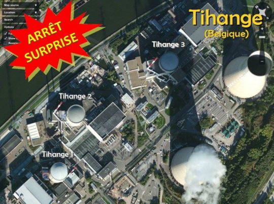Illustration : via image satellite Flash Earth, les trois réacteurs de Tihange vus du ciel. Le 13 aout dernier c'était le réacteur No3 qui déclarait forfait : Tihange 3 - le 4 mai c'est encore le réacteur No1 qui montrait ses faiblesses : Tihange 1