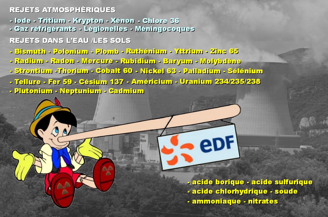 voir ici en bas à droite - EDF - en attendant la lumière, la propagande continue. Illustration : les rejets des centrales nucléaires, un cocktail N.B.C Nucléaire, Bactériologique (via les tours aéroréfrigérantes) et Chimique.