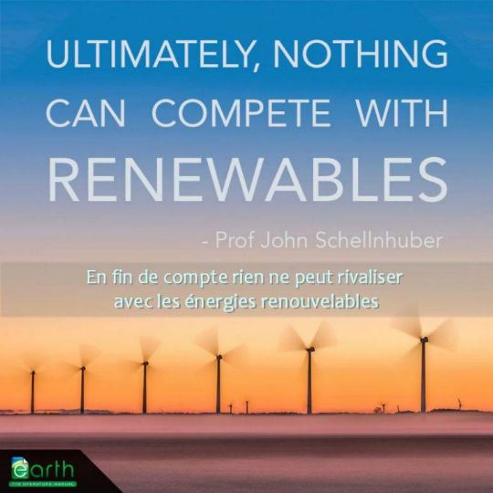 Illustration : « En fin de compte rien ne peut rivaliser avec les énergies renouvelables.» via la page (anglais) Earth the Operation manual - ...à part les économies d'énergies et l'efficacité énergétique, et soyons fous imaginons qu'un jour les installations renouvelables soient produites à l'aide d'énergie renouvelable et avec des matériaux recyclés... (ndlr)