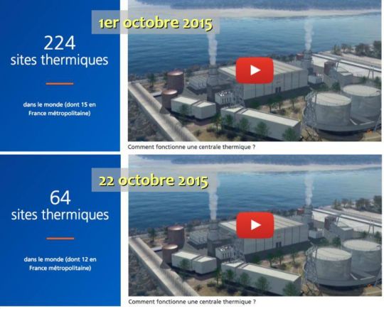 Illustration : Stupéfiant, en 22 jours EDF ferme 3 sites thermiques en France et 157 dans le monde... Images écran prises aux dates indiquées par le RSDN depuis le site officiel EDF à la page suivante : EDF
