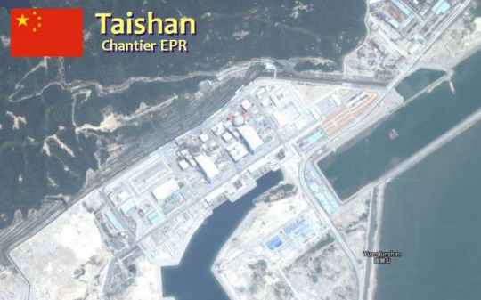 Illustration : Vue satellite des deux réacteurs EPR chinois à Taishan, dont l'unité 1 aurait du démarrer en juin 2015, mais peu d'informations émergent sur ce chantier depuis les défauts de cuve révélés par l'ASN en mars 2015. localisation : Google Map