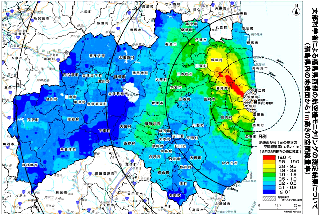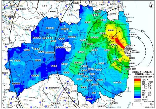 Illustration : relevé de doses ,en µSv/h à 1 mètre du sol, dans la préfecture de Fukushima.