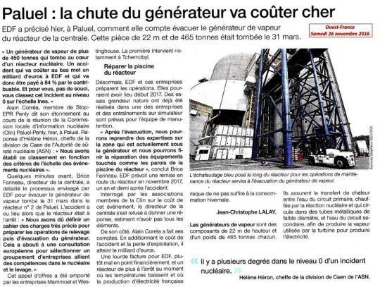 Illustration : « Paluel : la chute du générateur va coûter cher » : 26 novembre 2016 - Ouest-France