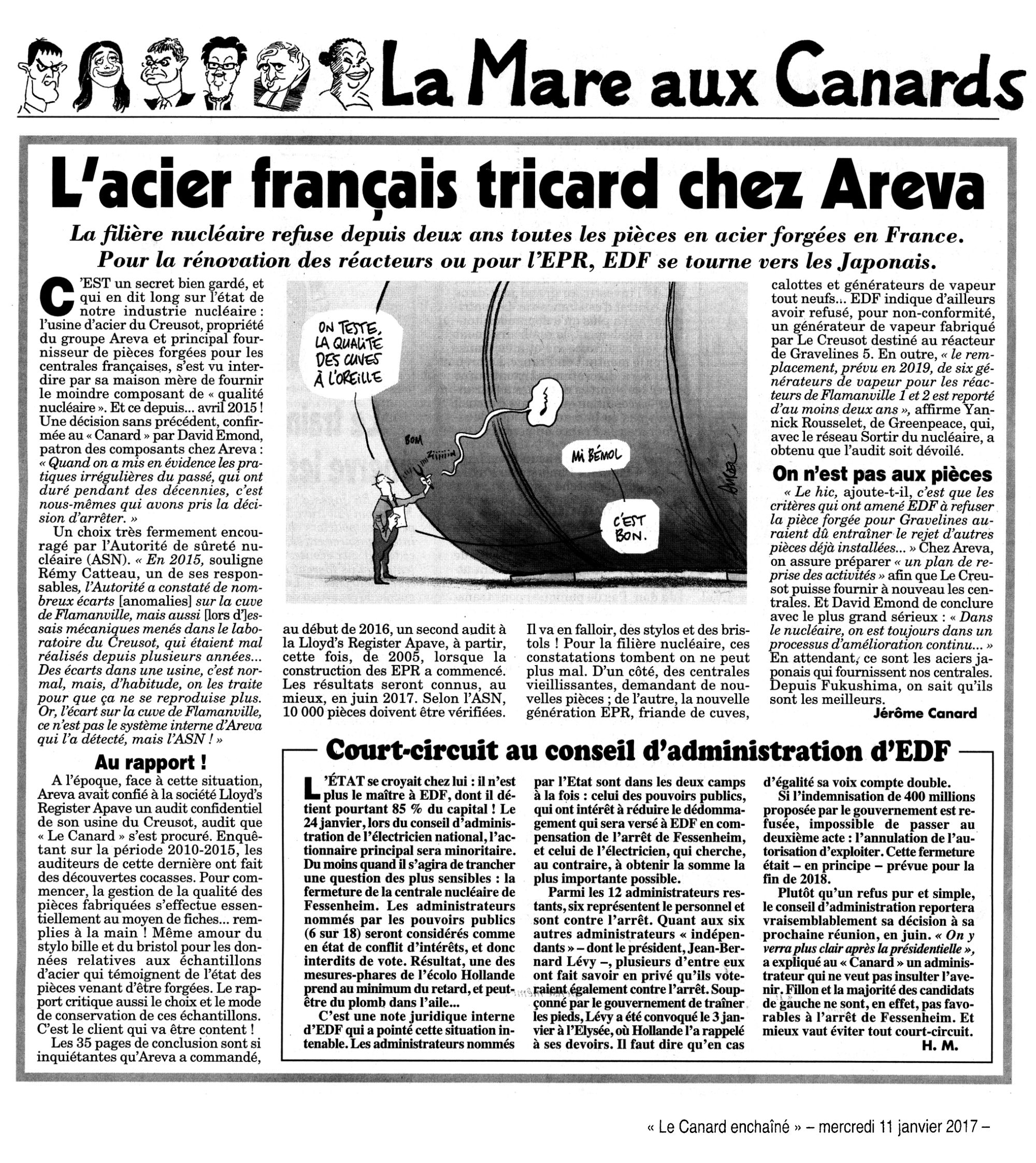🚫 « L'acier français tricard chez Areva » : 11 janvier 2017 - Le Canard Enchaîné