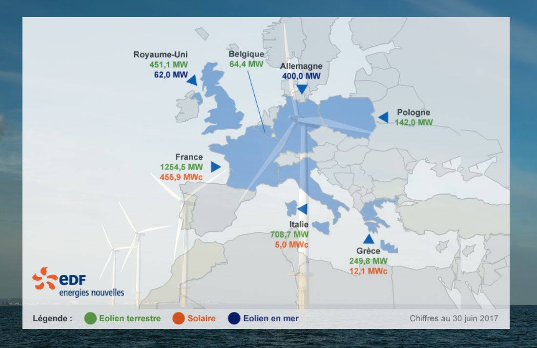 Illustration : Carte synoptique des capacités renouvelables exploitées par EDF Énergies Nouvelles, on notera les 400 MW d"éolien offshore exploités en Allemagne et le vide sur nos cotes, ainsi que les 1616 MW d"éolien terrestres exploités en Europe contre seulement 1254.5 MW sur notre territoire -