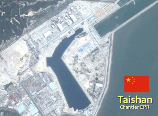 Illustration : vue satellite du chantier EPR chinois de Taichan, on notera l’imposant aménagement côtier pour l’alimentation en source froide des réacteurs (situés en haut de l'image), et pour la nouvelle logistique portuaire : Taishan