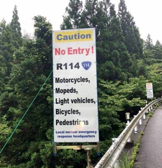 Illustration : restrictions d'usage pour la route 114, menant à la ville de Namié, l'un des secteurs les plus contaminés après l'accident nucléaire du 11 mars 2011. Les piétons et tout les véhicules non couverts sont priés de passer leur chemin, lien : Google Map