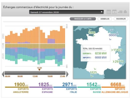 Illustration : les échanges commerciaux aux frontières (17 novembre 2018) montrent l'interdépendance des réseaux électriques frontaliers, avec un recours toujours accru aux productions germaniques, et même belges, en cas de légère baisse des températures. Rte / Eco2Mix / Échanges Commerciaux aux Frontières : Eco2Mix