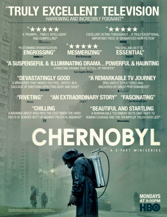 Illustration : Une affiche de promotion de la série CHERNOBYL de HBO, arborant une revue de presse dithyrambique.