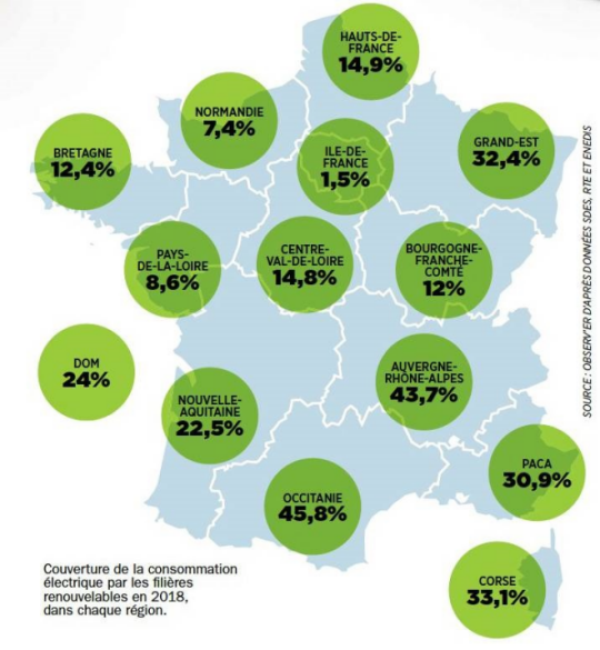 Illustration : parts régionales des renouvelables dans la consommation d'électricité, d'après compilation de données Sides / Rte / Enedis.
