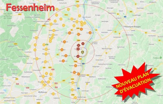Illustration : Carte produite par STOP Fessenheim, montrant l'étendue (20km) du nouveau Plan Particulier d'Intervention (PPI)