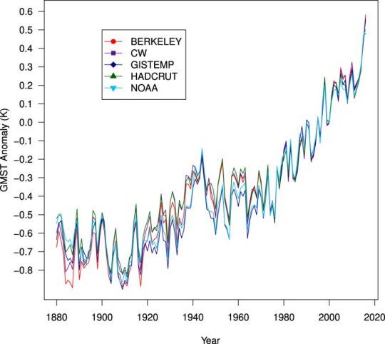 Illustration : variations de températures selon différentes études démontrant l'absence de pause dans les années 2000, source - Global Climat