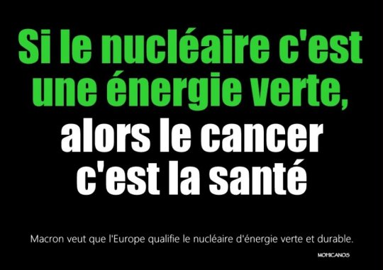 Illustration : MOHICANOS - Note : était-ce pour ne pas alourdir notre bilan carbone qu'aucun représentant du gouvernement français ne s'est déplacé chez nos voisin(e)s madrilènes lors de la COP25 ? (cf notre publication du 16/12/2019). Il semble, a contrario, que plus d'énergie soit dépensée pour élever auprès du conseil européen, notre production de déchets radioactifs au rang des énergies renouvelables.