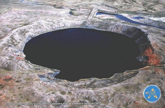 Illustration : cratère appelé le lac atomique, résultant d'un tir soviétique (1965) dans le Kazakhstan.