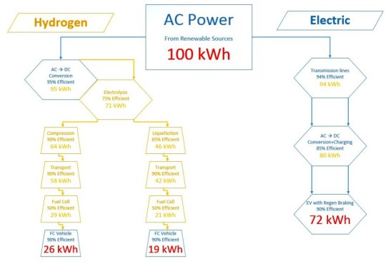 Illustration : du puits à la roue, les pertes comparées de l’électricité batteries (à droite) et de l'électricité par piles à combustible hydrogène (à gauche). Le domaine de rentabilité de l'hydrogène se situe, en l'état actuel de la technologie, sur des installations dont le volume et les conditions d'utilisation ne sont pas substituables par des batteries électriques.