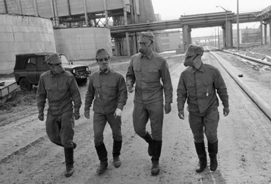 Illustration : membres d'une unité de décontamination en marche vers la centrale accidentée de Tchernobyl