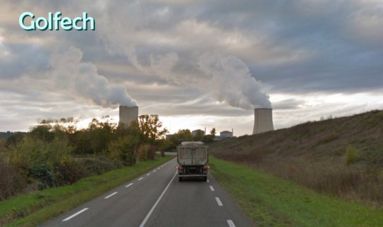 Illustration : UPDI de Golfech, notez la hauteur de la digue qui longe la route, cette configuration d'apport en source froide n'est pas sans rappeler, entre autres, Fessenheim.