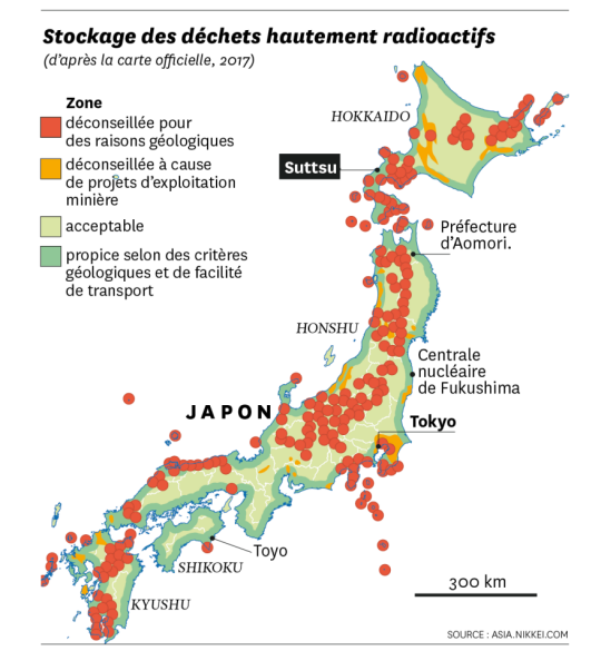 Illustration : via Courrier International, le gouvernement japonais considère une large partie des terres et des cotes japonaises, acceptables voire propices à l'enfouissement des déchets les plus radioactifs, les populations concernées beaucoup moins...