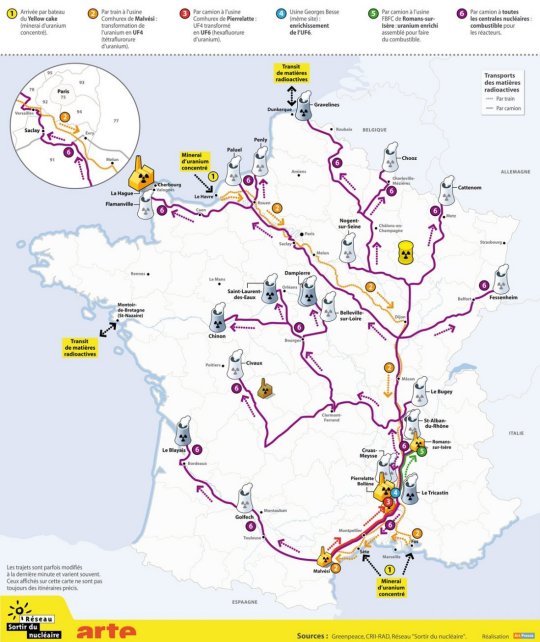 Illustration : via Réseau Sortir Du Nucléaire, Cartes de France des transports de matière nucléaire - RSDN