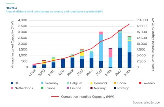 Illustration : évolution des capacités de l'éolien en mer (offshore) Wind Europe