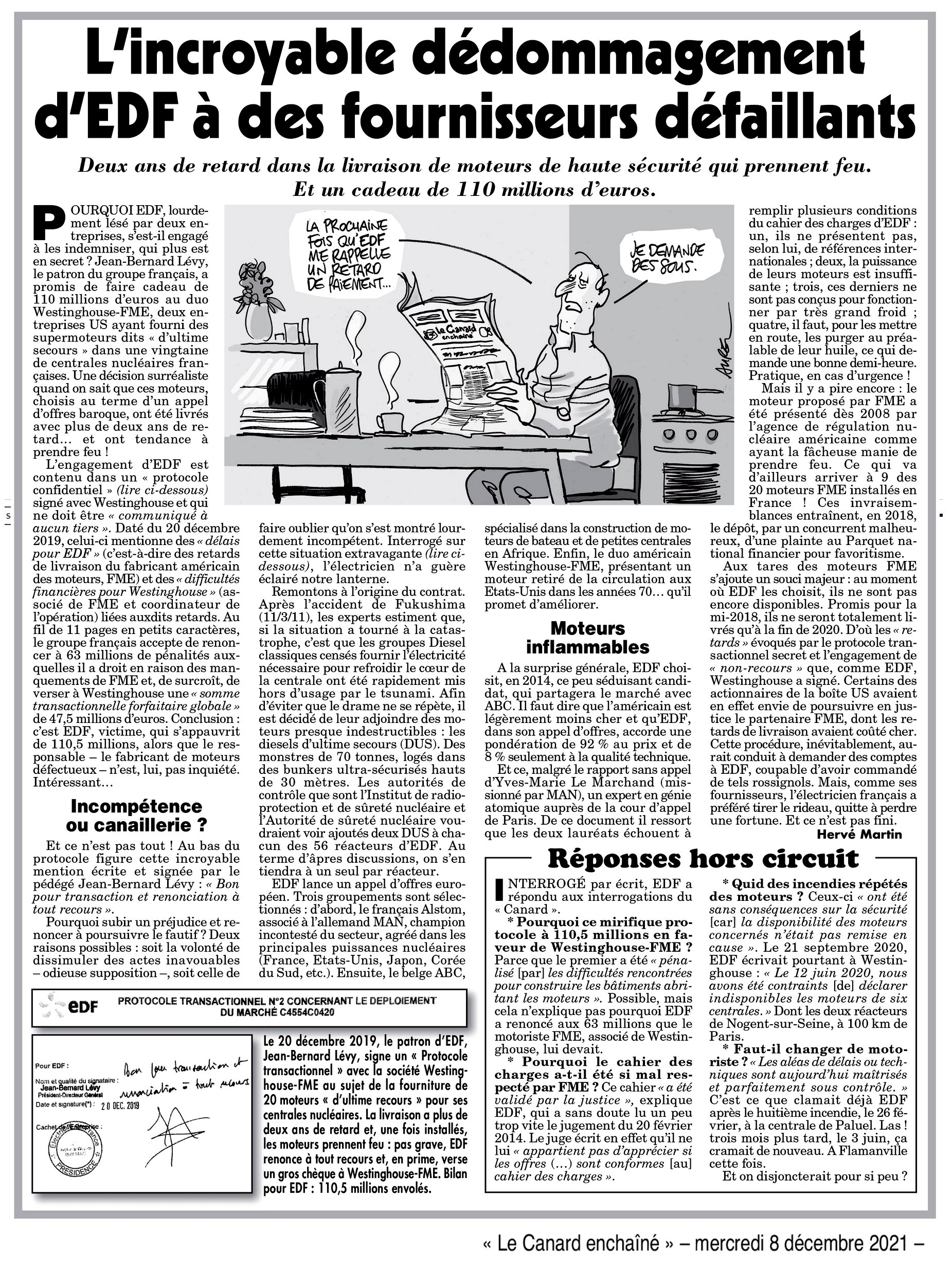 🚨 « L'incroyable dédommagement d'EDF à des fournisseurs défaillants » : 8 décembre 2021 - Le Canard enchaîné