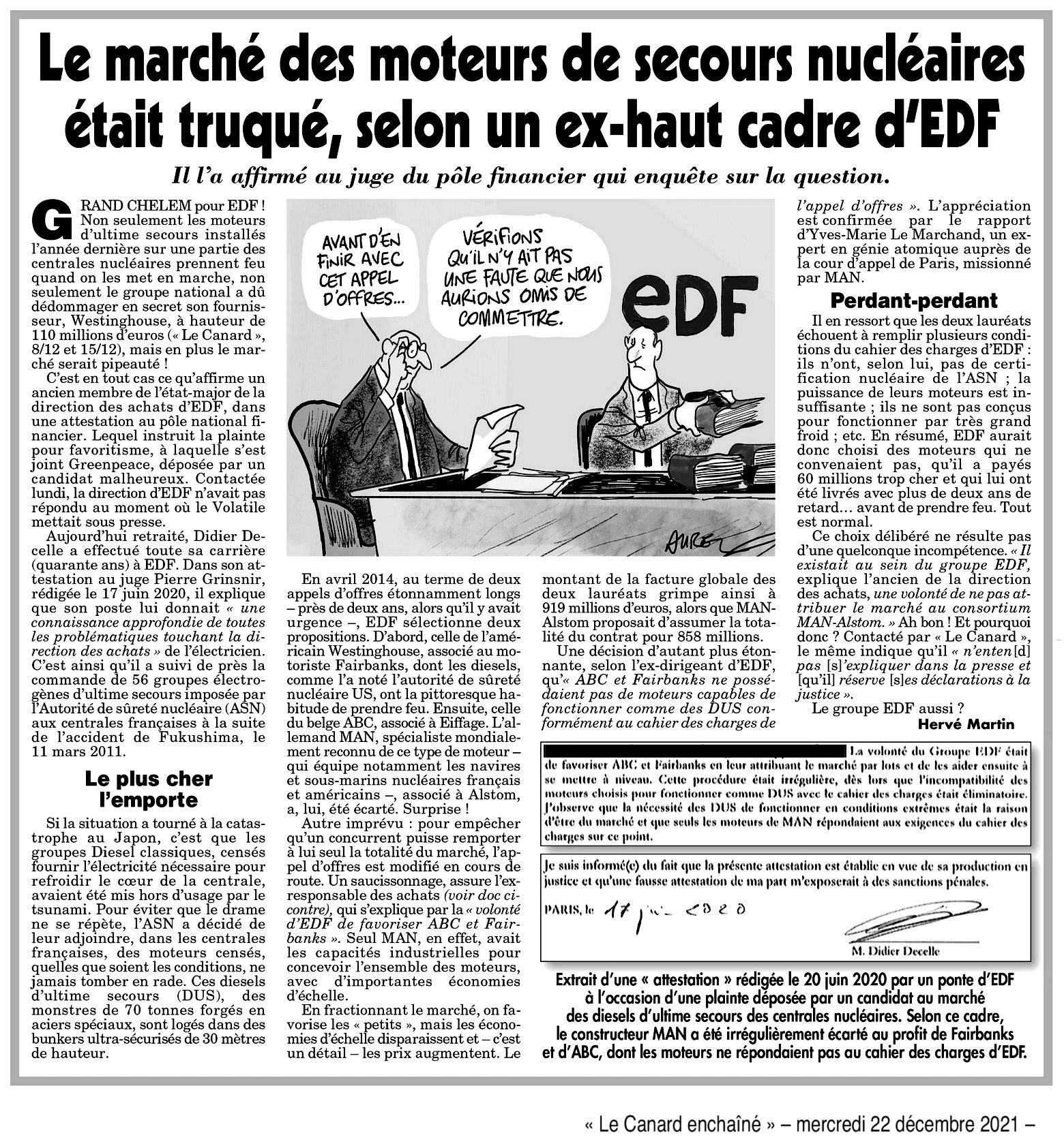 🚨 « Le marché des moteurs de secours nucléaires était truqué, selon un ex haut cadre d'EDF » : 22 décembre 2021 - Le Canard enchaîné