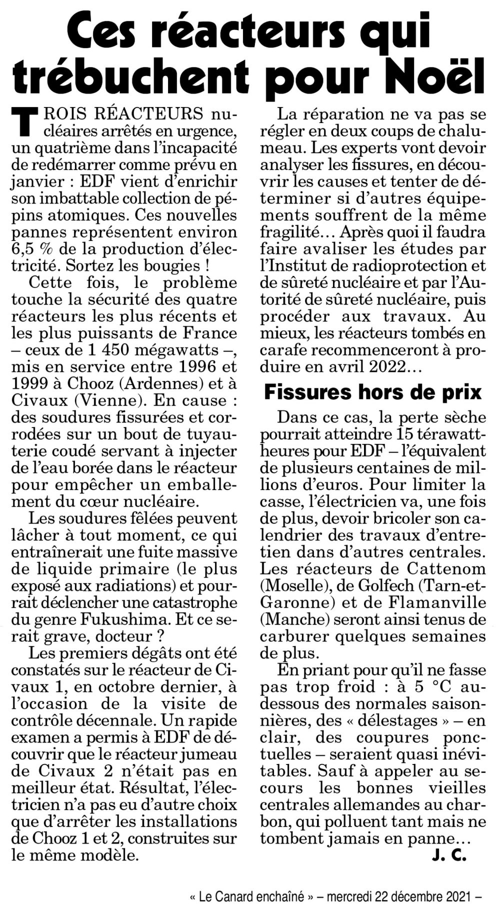 🚨 « Ces réacteurs qui trébuchent pour Noël » : 22 décembre 2021 - Le Canard enchaîné