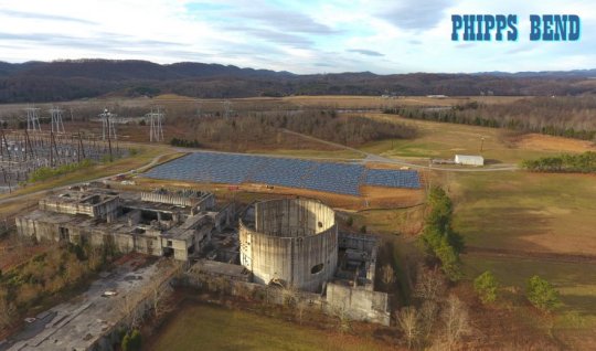 Illustration : le chantier de la centrale nucléaire américaine de Phipps Bend abandonné en 1981, voit désormais pousser un parc photovoltaique. 29 aout 2017 - Solar Power World Online