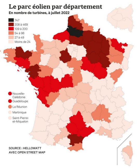 Illustration : via « Le paysage très déséquilibré de l'énergie éolienne en France .» 26 juillet 2022 - Les Echos