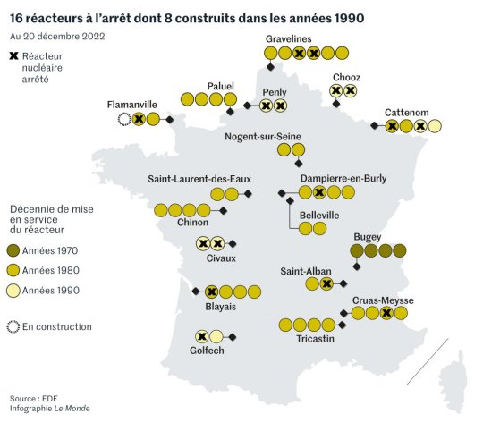 Illustration : via l'article du monde du 21 décembre 2022 dont nous recommandons chaudement la lecture (abonnés) - « Grandeur et décadence du nucléaire en France .» Le Monde (abonnés)