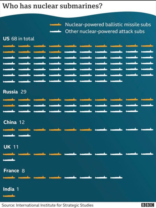 Illustration : sous la surface le rapport de force entre puissances nucléaires diffère du simple comptage du nombre d'ogives atomiques, avec l'aide américano /britannique l'Australie s'apprête à entrer rapidement dans ce tableau.