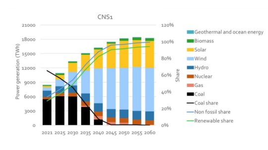 Illustration : moins connu que le WNISR cité ci-dessus dans Ouest-France, le CETO 2023 : Perspectives de transformation énergétique de la Chine 2023, d'où est tirée cette infographie (page 132 - CNS1 /Carbon Neutral Scenario 1 ) n'en est pas d'un moindre intérêt.