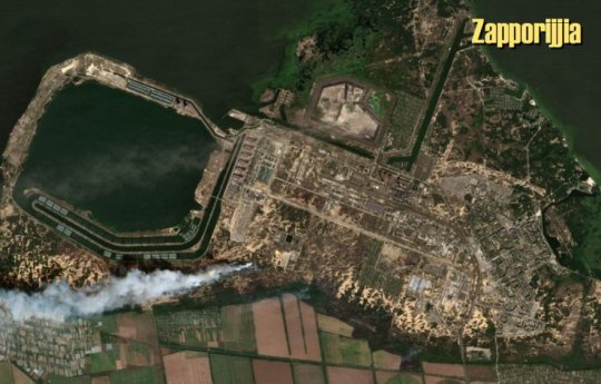 Illustration : la centrale ukrainienne de Zaporijia, avec sont vaste bassin de refroidissement, ses 6 réacteurs qui apparaissent minuscules. Photo satellite prise pendant un incendie au sud des installations.