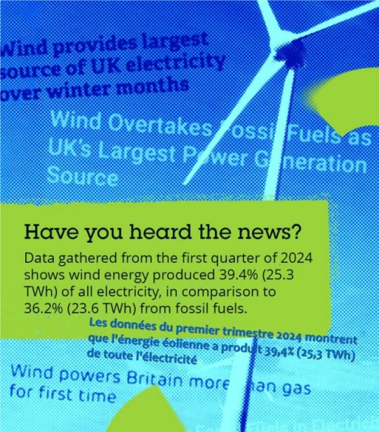 Illustration : via Ecotricity (UK) " Les données du premier trimestre 2024 montrent que l'énergie éolienne a produit 39,4% (25,3 TWh) de toute l'électricité, en comparaison des 36,2% (23,6 TWh) des énergies fossiles." le charbon effacé en coup de vent du paysage britannique