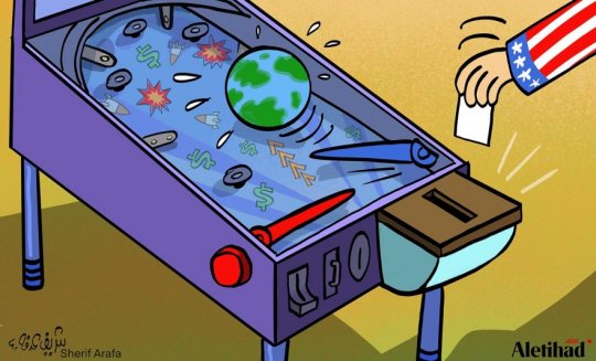 Illustration : dessin de Sherif Arafa pour Aletihad, l'idée est ici que les USA chahutent la planète à coup de dollars et de bombes, mais il s'adapte à celle des dégats climatiques infligés par la future administration Trump bis (ndlr)
