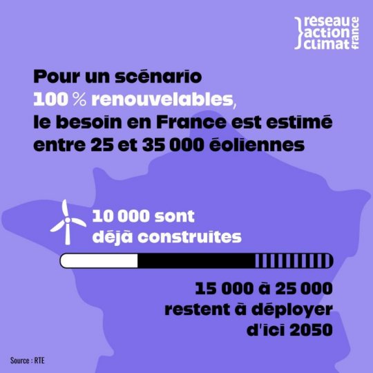 Illustration : via Réseau Action Climat, nombre d'éoliennes comprises dans un mix énergétique diversifié et en fonction du scénario proposé.