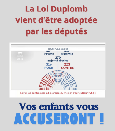 ❦ 18 juillet 2025 - « Une pétition pour rejeter la loi Duplomb recueille plus de 200 000 signatures » : La Relève et la Peste - « Contre la loi Duplomb, une pétition pulvérise tous les records » : Reporterre