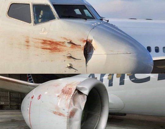 Illustration : l'éolien fera part égale avec le transport aérien (au demeurant toujours abondement récréatif et climaticide), quand on ordonnera la fermeture d'un aéroport agrémenté d'amendes à 5 zéros, du fait de collisions avec la faune aviaire, ici un accident avec un Boeing 737-800 d'American Airlines