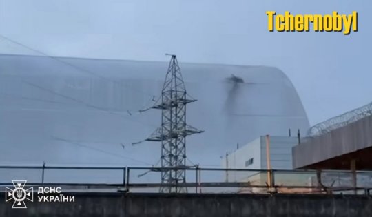 Illustration : 14 février 2025 un drone d'attaque russe s'écrase et perfore l'arche de protection de la centrale nucléaire accidentée de Tchernobyl