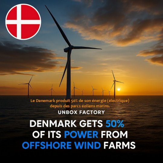 Illustration : via Unbox Factory - " le Danemark produit 50% de son énergie (électrique) depuis des parcs éoliens marins "